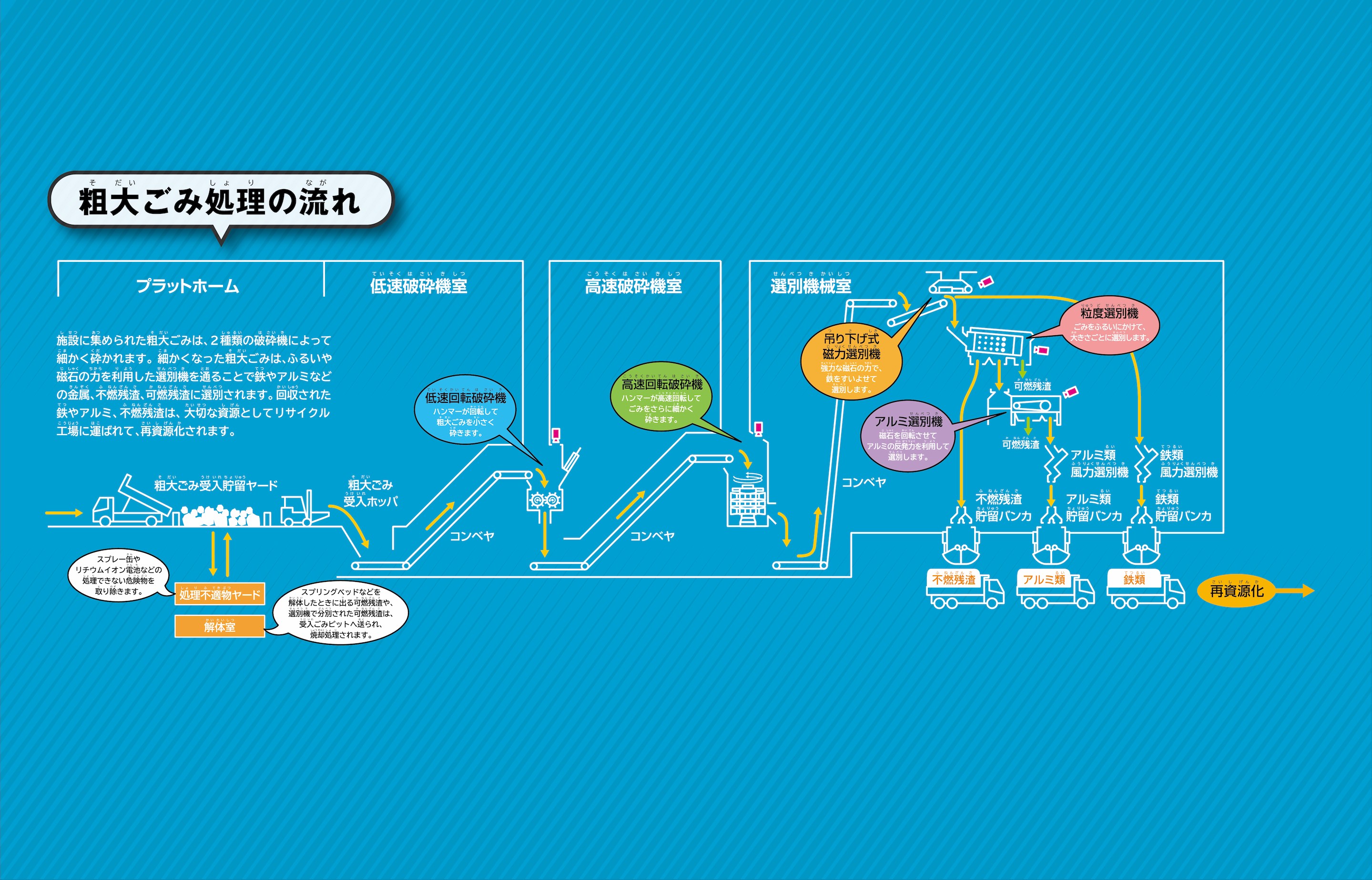 施設に集められた粗大ごみは、処理不適物ヤードなどで危険物や資源を取り除きます。その後、2種類の破砕機によって細かく砕かれ、磁石やふるいの力を利用した選別機を通して鉄やアルミなどの金属、不燃残渣、可燃残渣に選別されます。