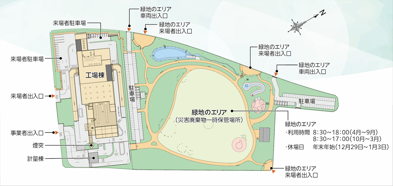 | 設備概要 | ①焼却施設 処理能力:226t/日(113t/日・炉×2炉) 処理方式:ストーカ式焼却炉 発電設備:蒸気タービン・タービン発電機(最大出力4,510kW) ②粗大ごみ処理施設 処理能力:12t/日(5h) 処理方式:低速回転破砕機 高速回転破砕機 ③緑地のエリア 大規模災害時は可燃性災害廃棄物の一時保管場所として使用 |